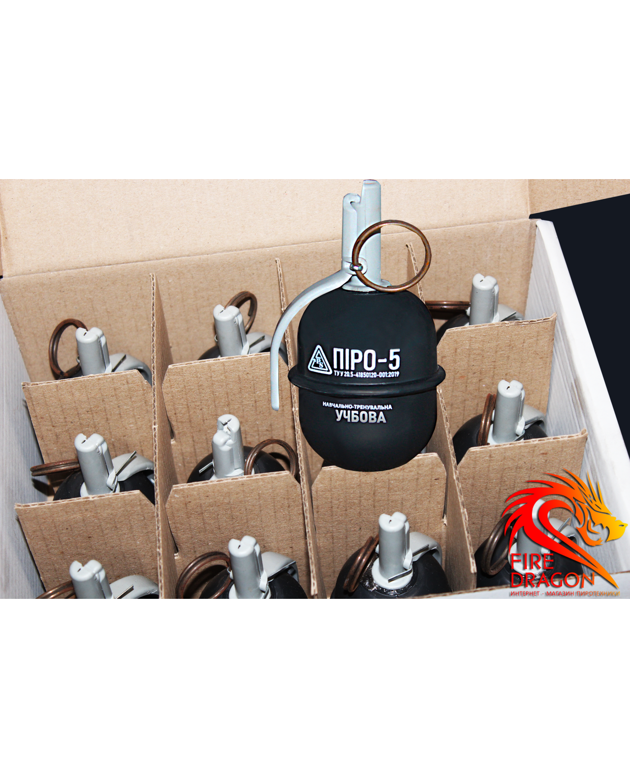 Учбова граната з активною чекою Піро-5, в ящику: 12 штук, наповнювач: металева стружка - Арт. П-5УЯ